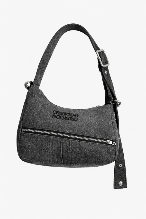 Cartera de denim lavado (acid wash) con bordado, bolsillo frontal con cierre, 2 tarjeteros y bolsillo interno. Hebilla metálica para regular largo. Cierre en el fondo para ampliar. Dos ganchos metálicos laterales tipo tuerca para colgar objetos.