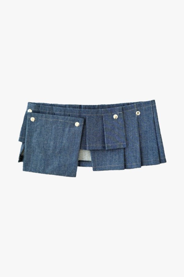Micro falda / mini cinturón tableada de denim regulable con broches métalicos. Tiene un bolsillo desmontable.