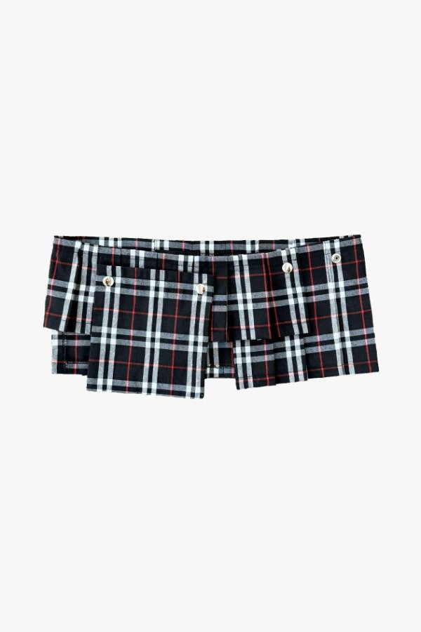 Micro falda / mini cinturón tableada de algodón regulable con broches métalicos. Tiene un bolsillo desmontable.