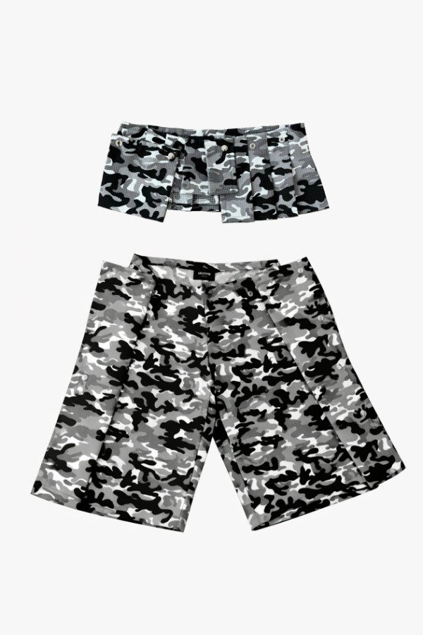 Jort de ripstop con múltiples formas de uso generadas con broches metálicos + Micro falda / mini cinturón tableada de ripstop regulable con broches métalicos y un bolsillo desmontable.