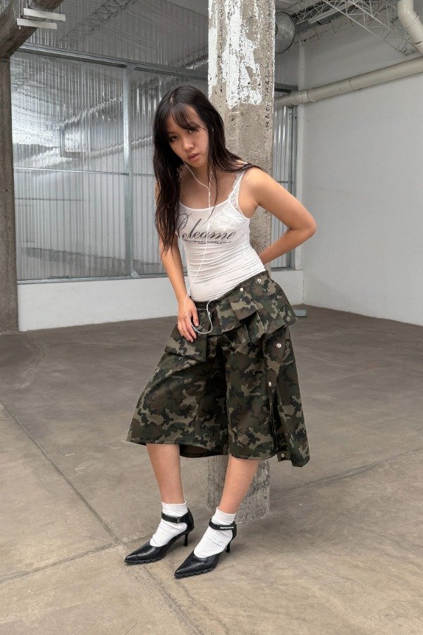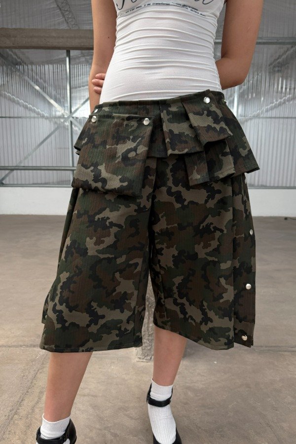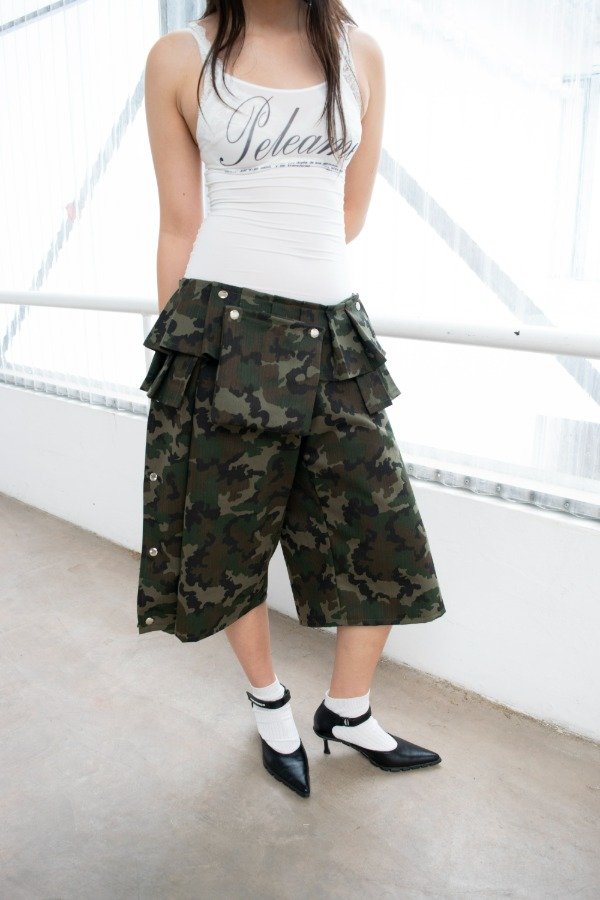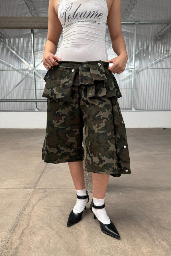 Jort de ripstop con múltiples formas de uso generadas con broches metálicos + Micro falda / mini cinturón tableada de ripstop regulable con broches métalicos y un bolsillo desmontable.